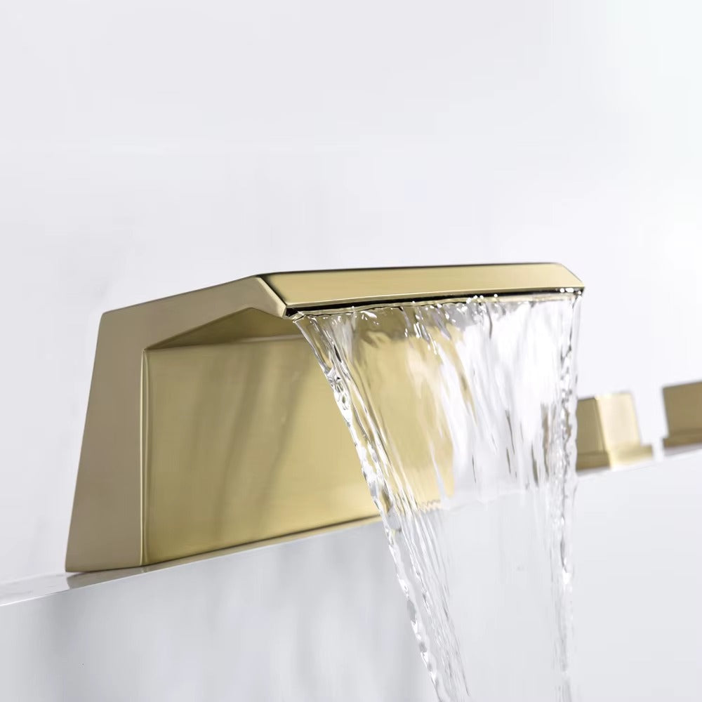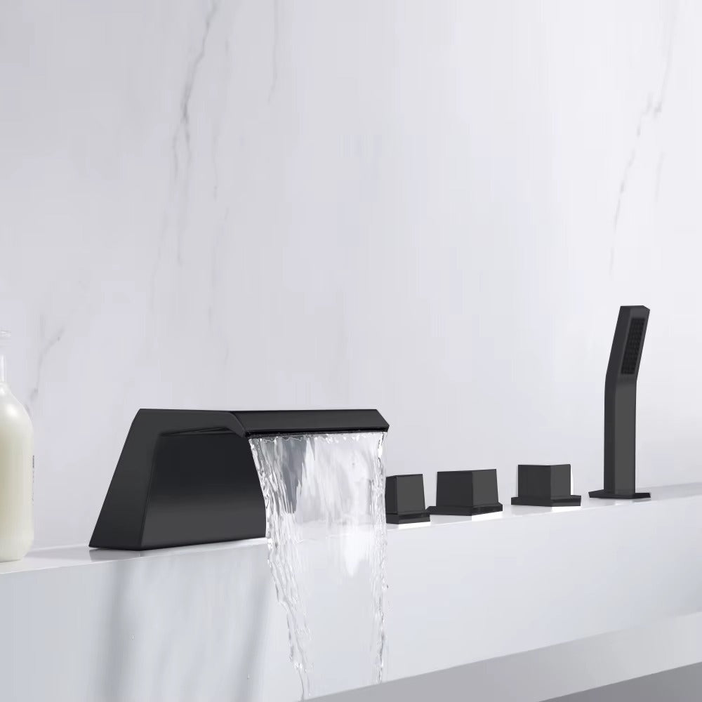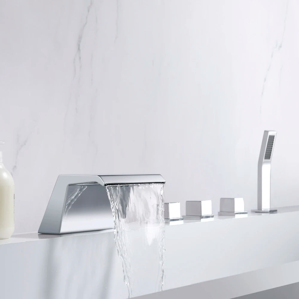 Introducing the Chisholm - modern elegance meets practicality with our brass waterfall bathtub tap set. Enjoy the soothing flow of water from the uniquely designed spout while having the added convenience of a pull out shower. Upgrade your bathing experience now.