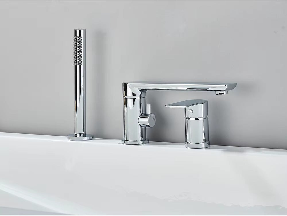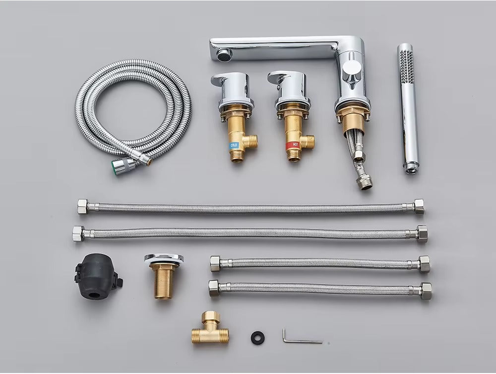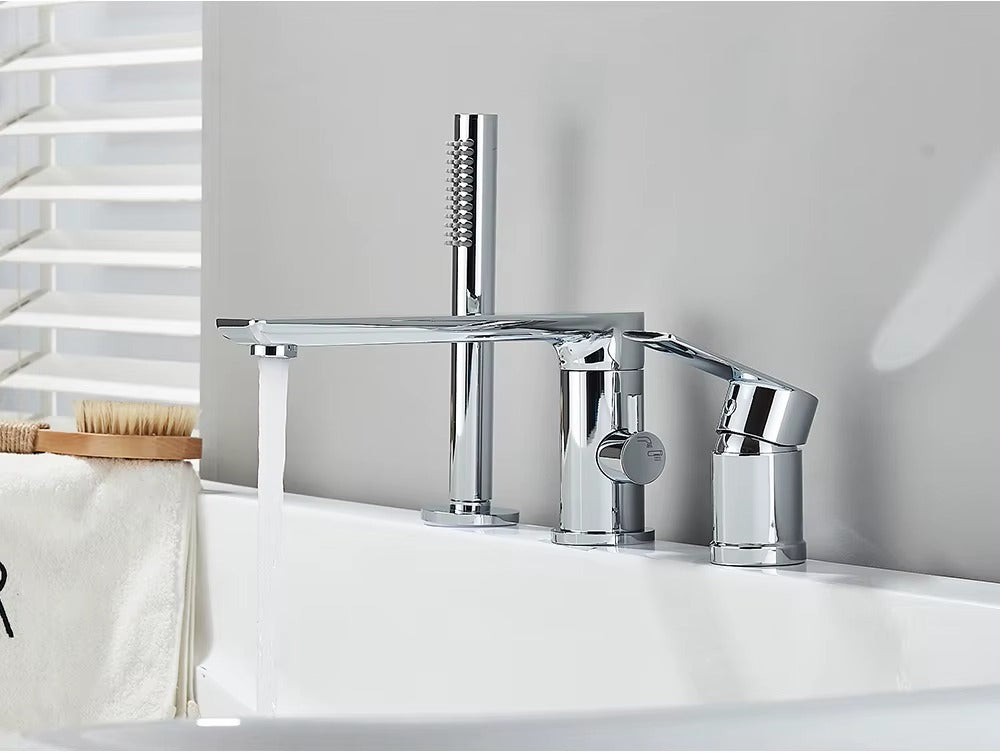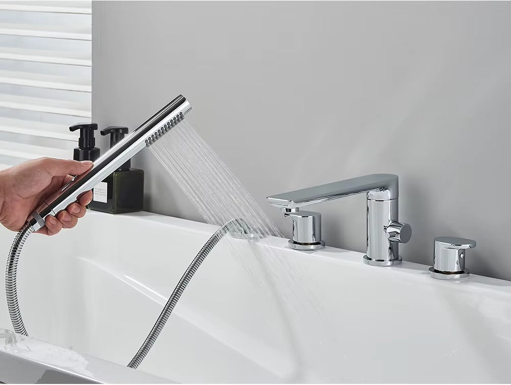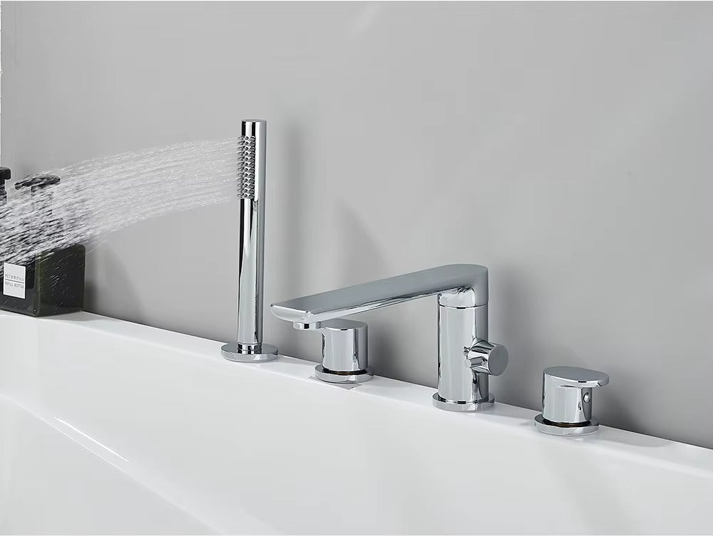 Upgrade your bathroom with our Verania Modern 4 Piece Bathtub Tap Set. This sleek set includes a handheld shower for added convenience. The perfect combination of style and function, it's sure to elevate your bathing experience. With a modern design and