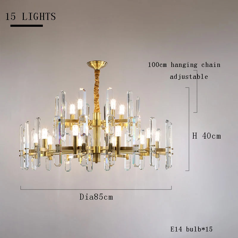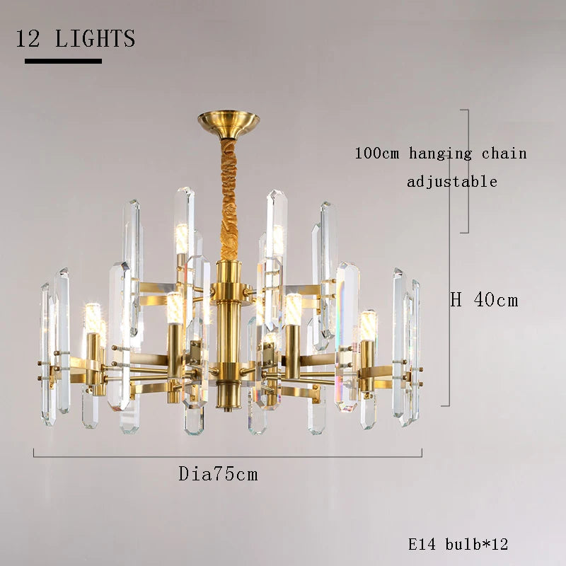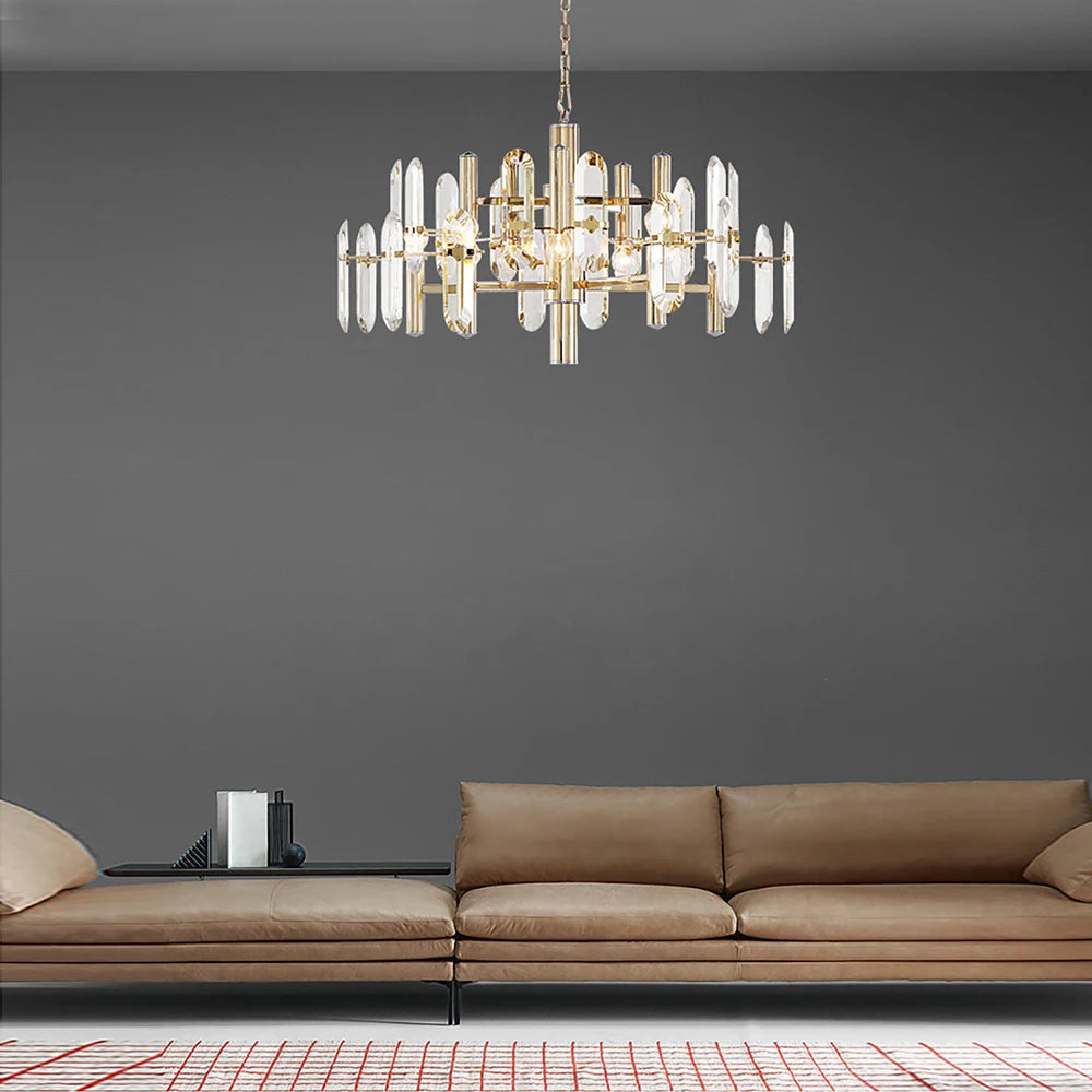 Introducing Amelky , the ultimate statement piece for your home. This hanging chandelier exudes elegance and luxury with its crystal glass accents and sleek design - available in silver, black, and gold. Illuminate any space with this exclusive and tasteful addition to your decor.