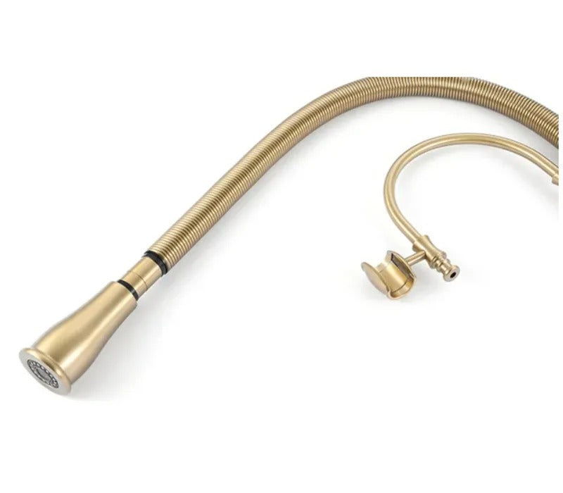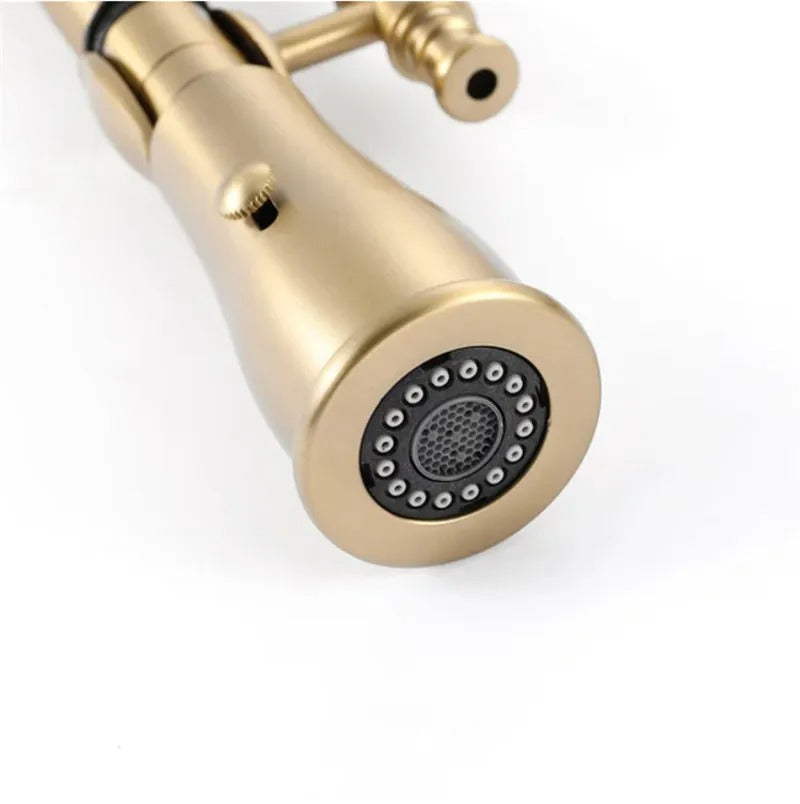 Upgrade your kitchen with the Dorene Gold Brass Porcelain Pull Down Dual Mixer Kitchen Tap. Made with quality materials and a sleek design, this tap is the perfect addition to any modern kitchen. Enjoy the convenience of a pull-down sprayer and the elegance of porcelain handles. Experience the perfect blend of style and functionality with Dorene.