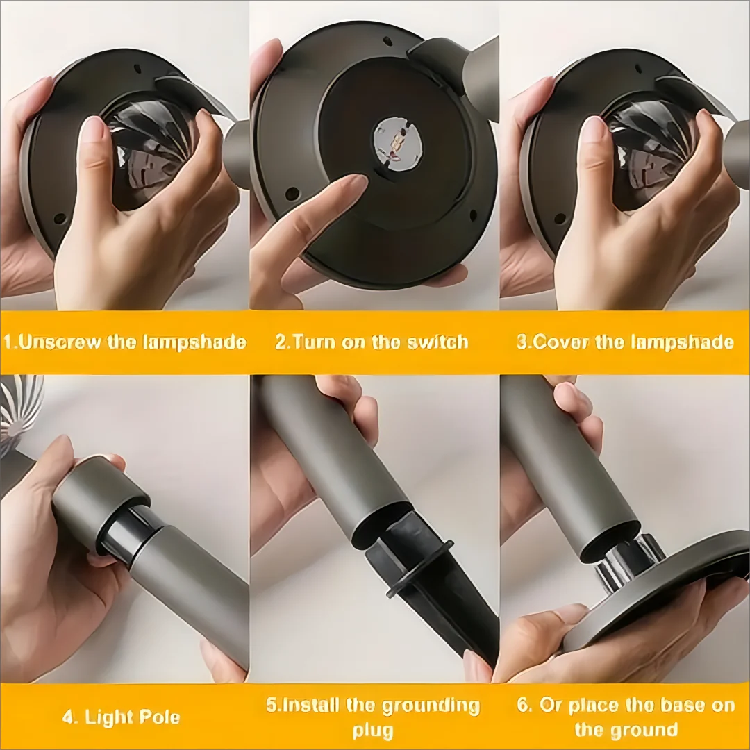 Designed for outdoor use and for all weather conditions. No worries about raining, snowing, frosting, even sleeting. Adds unique decorative charm to any landscape, ideal for garden, lawn, patio, yard, walkway, driveway.The solar panel converts sunlight during the day, charges the battery for 6-8 hours, and automatically turn on at dusk, can last for 8 hours or more.Before charging, need to turn the lamp 30 degrees counterclockwise to separate, and then TURN ON switch.